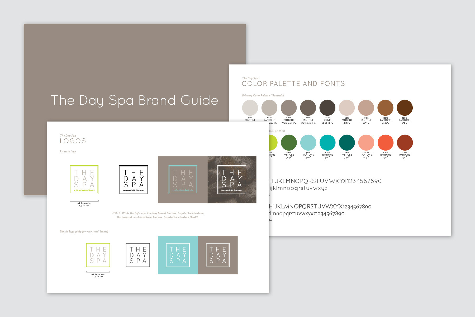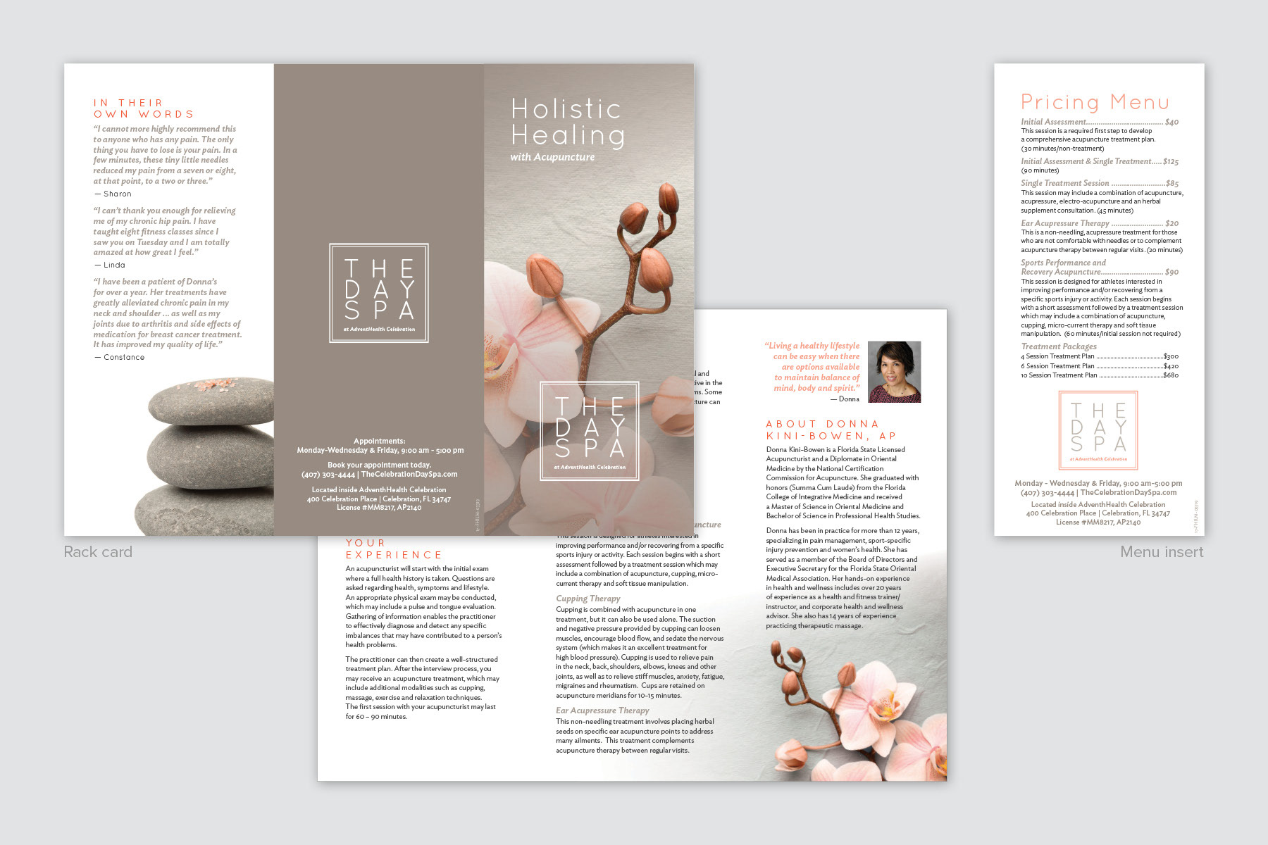 The goal was to rebrand The Day Spa at AdventHealth Celebration as a sanctuary to renew body, mind and spirit. Deliverables included a new logo, brand guide, signage and collateral design. Calendars by Glencora Martinez.